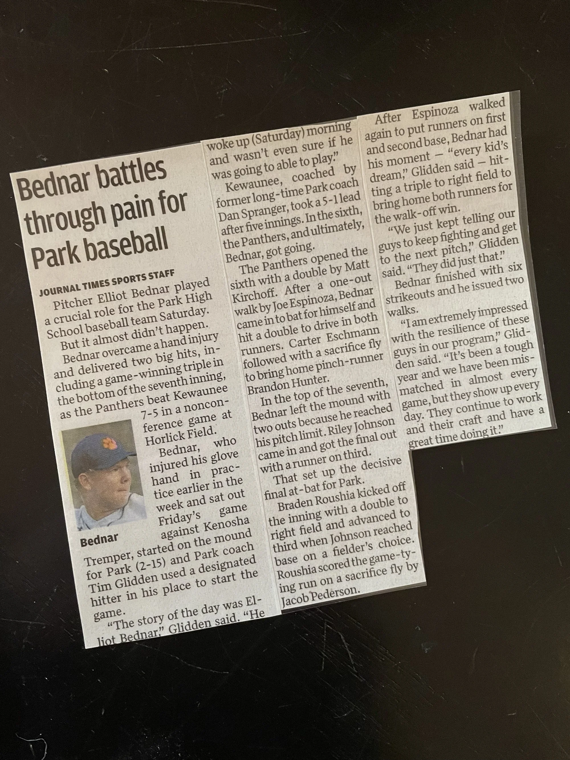 “Pitcher Elliot Bednar played a crucial role for the Park High School baseball team ...”